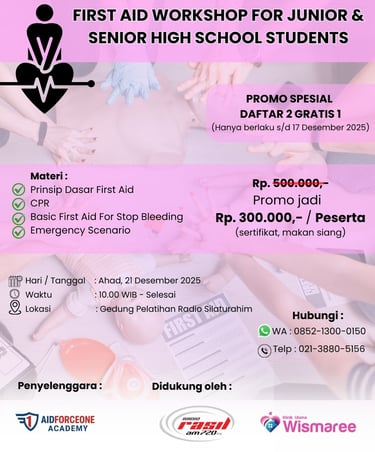 Melihat kebutuhan ini, kami menghadirkan First Aid Training khusus untuk siswa SMP dan SMA, sebagai program edukasi yang bertujuan meningkatkan kesiapsiagaan, rasa percaya diri, dan kemampuan respon darurat para remaja.
