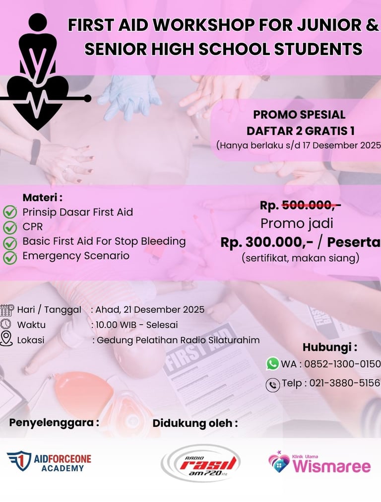Kecelakaan dan kondisi darurat dapat terjadi kapan saja—baik di sekolah, rumah, maupun lingkungan umum. Sayangnya, sebagian besar remaja belum dibekali keterampilan dasar untuk memberikan pertolongan pertama yang benar dan aman. Padahal, tindakan awal dalam 3–5 menit pertama dapat menentukan keselamatan seseorang sebelum bantuan medis profesional tiba.